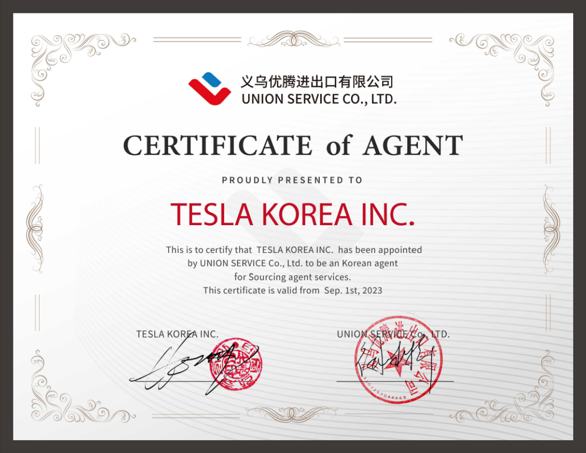 20년 수출입 전문회사 테슬라코리아는 UNION SERVICE 의 한국 공식에이전트 입니다.